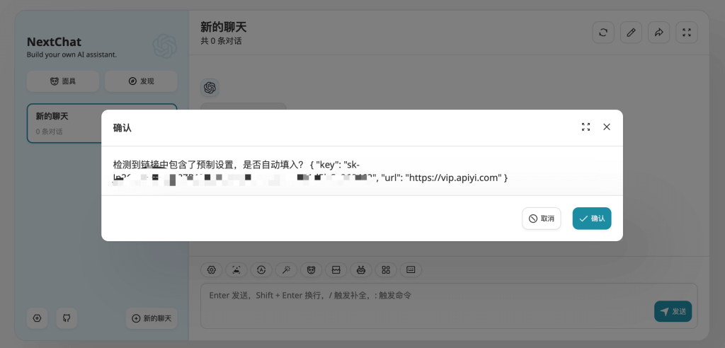 进入 对话栏目 ,会直接提示填入 Key 和 地址,这样就启用了