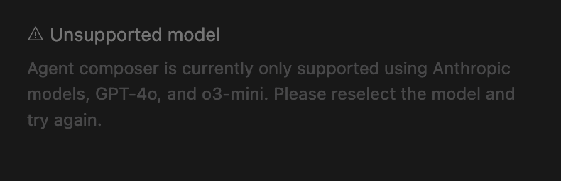 ⚠️ 重要说明:最新版本的 Cursor 中,Agent Composer 模式仅支持 Anthropic 官方模型、GPT-4o 和 o3-mini。这意味着: